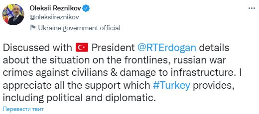 "Обсудил с президентом Турции Реджепом Тайипом Эрдоганом подробности ситуации на передовой, военные преступления России против мирного населения и ущерб, нанесенный инфраструктуре. Я ценю всю поддержку, которую оказывает Турция, в том числе политическую и дипломатическую", - написал Резников в Twitter.