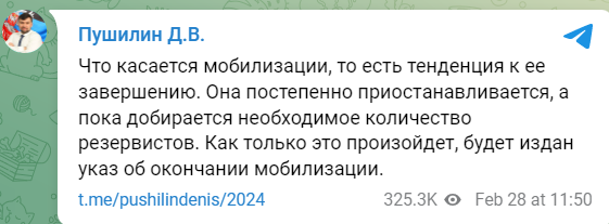 Затем он повторил почти то же самое 17 марта. В эфире горловского телевидения "глава ДНР" заявил, что "мобилизационная кампания близка к завершению". При этом Пушилин заявил, что резервы еще нужны и призыв пока что будет продолжен.