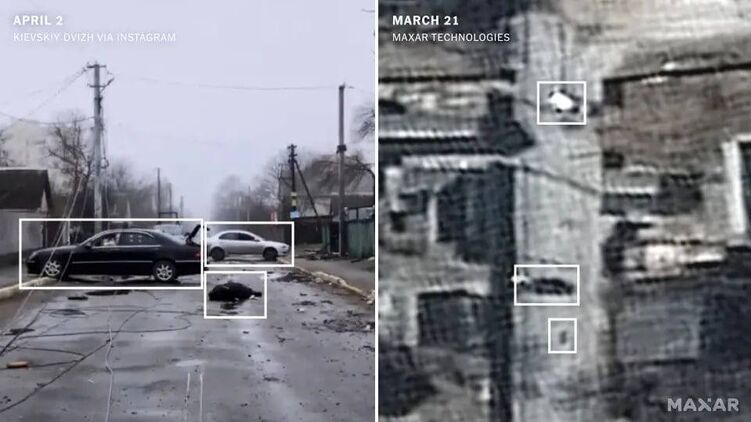 Спутниковые снимки, предоставленные изданию компанией Maxar Technologies, показывают, что по крайней мере 11 из тел, разбросанных по улице Яблонской, находились там с 11 марта, когда Россия, оккупировала город.