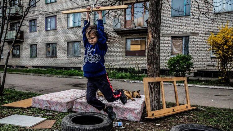 "Дети выбежали из почти заброшенного жилого дома, чтобы поиграть. Их семья хотела уехать из Краматорска, но им некуда было идти, сказала их мать. "Они напуганы, но что мы можем сделать?" сказала она со вздохом.