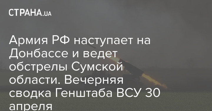 В Генеральном штабе Вооруженных сил Украины опубликовали вечернюю оперативную сводку с фронта боевых действий по состоянию на 18:00 30 апреля. В ней говорится, что российские войска обстреливают позиции ВСУ в Сумской области, а также продолжают наступление на Донбассе.
