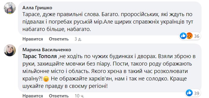 Но звучат и другие мнения."Не ходите по чужим домам. Взяли оружие в руки - защищайте молча без пиара. Посты такого рода оскорбляют миллионный город и область. Какого хрена в такое время раскалывать страну? Не обижайте харьковчан, нам и так не сладко. Лучше ищите правду в своем регионе!", - написала одна из пользовательниц.