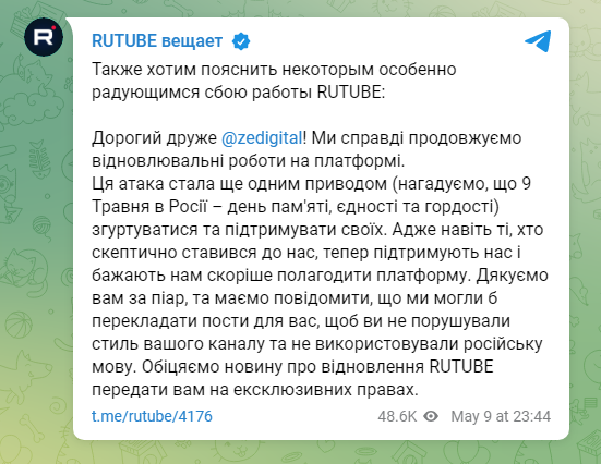 "Неработающий вторые сутки Rutube заговорил по-украински. Будем работать дальше, пока Кремль не заговорит", - написал он.
