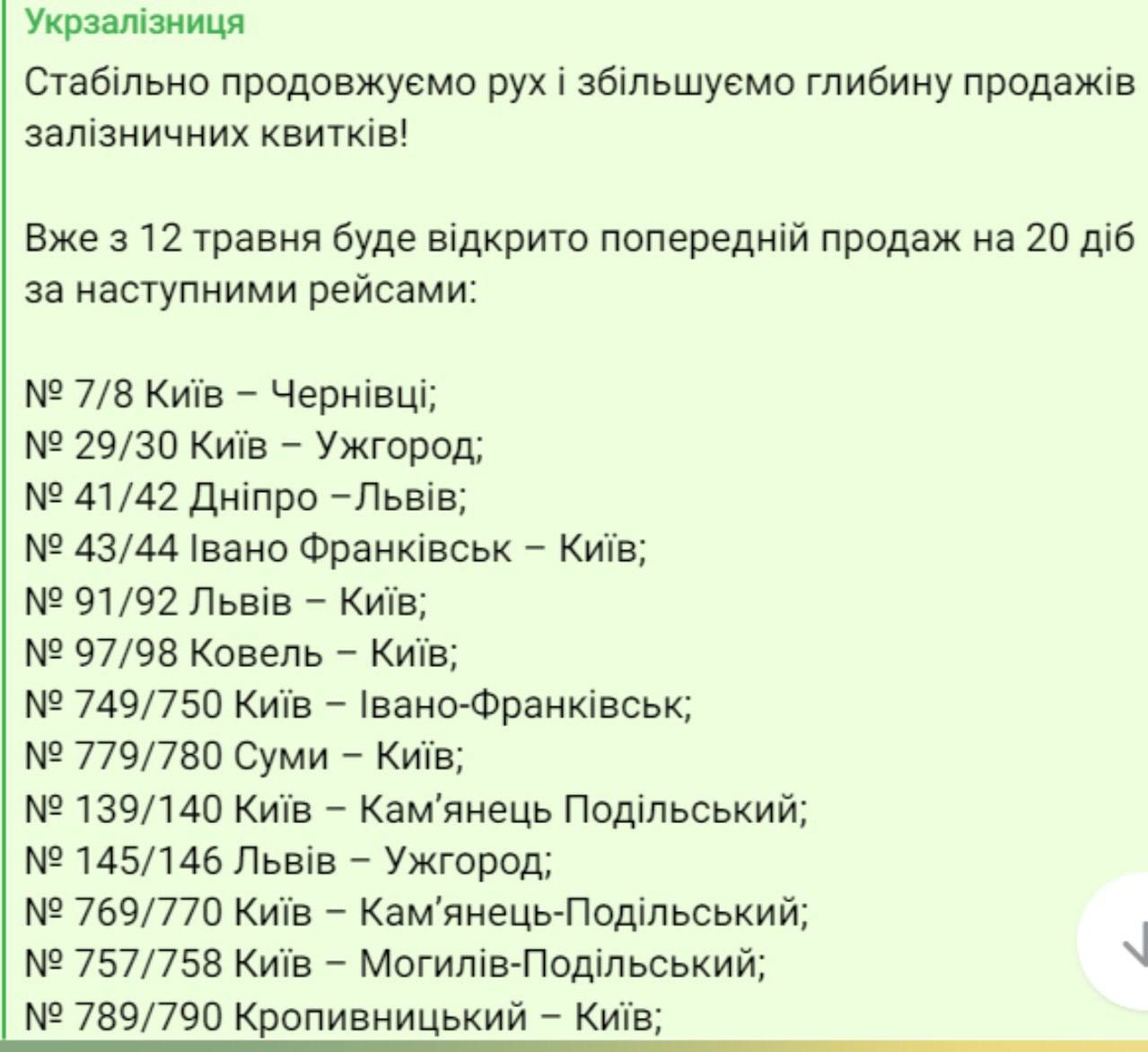22.54 "Укрзализныця" сообщает о восстановлении 14 маршрутов поездов. Уже с 12 мая будут открыты предварительные продажи на 20 суток по следующим рейсам: