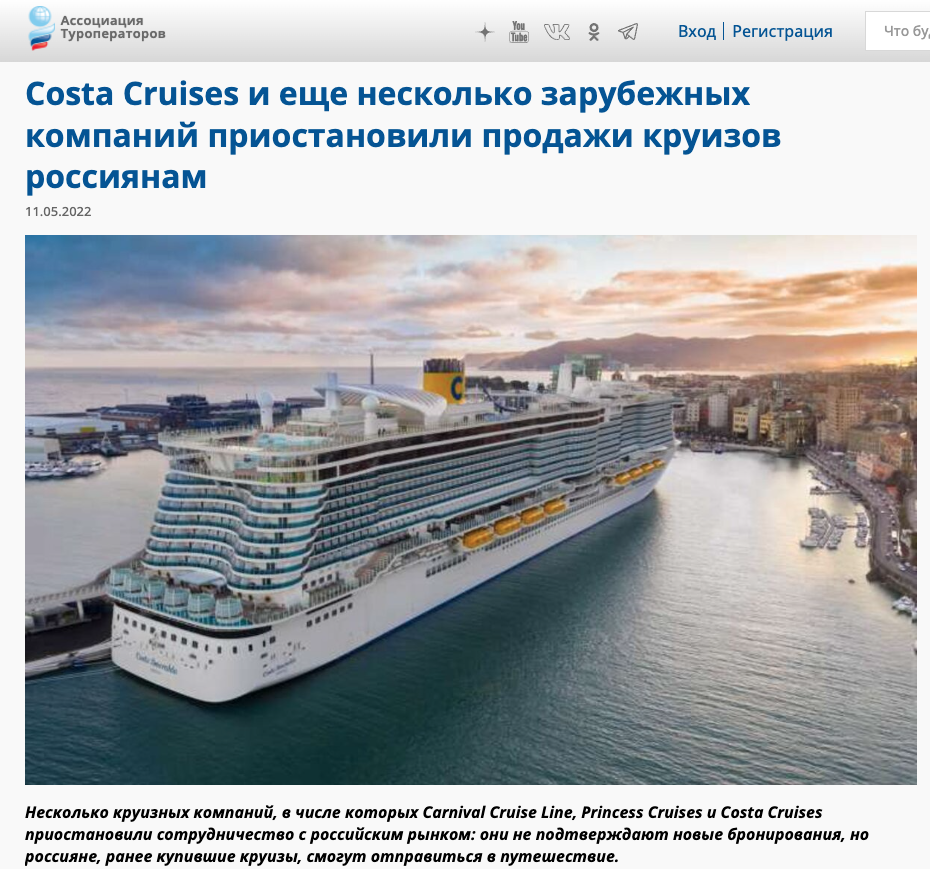 В частности, продажи для россиян закрыли Carnival Cruise Line, Princess Cruises, Cunard Line, Quark Expeditions, Holland America Line Cruises, Regent Seven Seas Cruises и Seabourn Cruise Line.