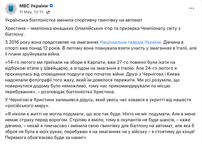 "Я никогда в жизни не могла подумать, что все так будет. Никто не мог подумать. Но у меня нет страха перед врагом. Стреляю я умело, поэтому у оккупантов не будет шансов. Пусть я временно и сменила свою винтовку для биатлона на автомат, но какое бы оружие ни держала в своих руках – нахожусь на соревнованиях или в армии – я буду стоять до конца! Победа обязательно будет за нами!" - сказала Дмитренко.