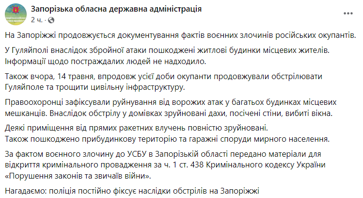 На протяжении всех суток 14 мая противник продолжал обстреливать Гуляйполе и разрушать инфраструктуру.
