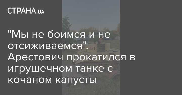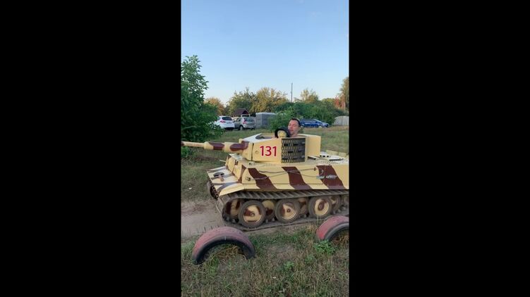 В нем он едет в миниатюрном танке с кочаном капусты, на который надета каска.