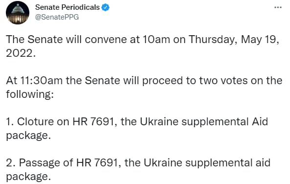 Сегодня, 19 мая, Сенат США поставил в повестку дня законопроект о военной помощи Украине. На кону - 40 миллиардов долларов, которые пойдут на заказы для американского ВПК. Об этом говорится в Twitter Сената.