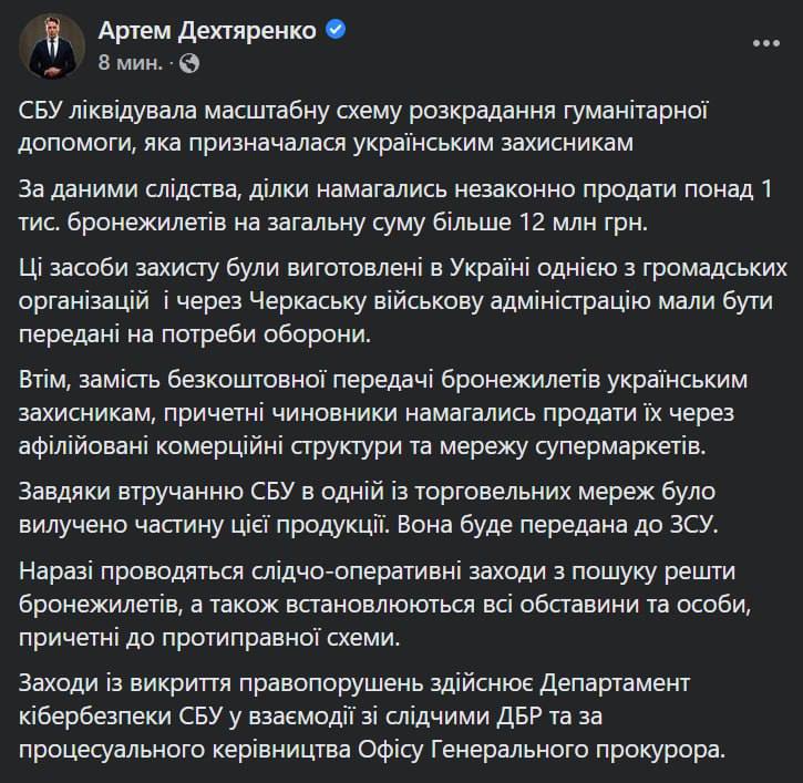 В СБУ заявили о ликвидации масштабной схемы с разворовыванием гуманитарки на 12 миллионов гривен. Бронежилеты для фронта оказались в продаже в супермаркетах.