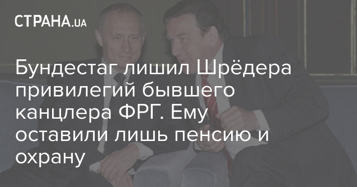 Бундестаг лишил бывшего федерального канцлера Германии Герхарда Шрёдера части привилегий, положенных экс-главам правительства. В частности, его лишили офиса в парламенте и сотрудников, оставив право на пенсию и охрану.