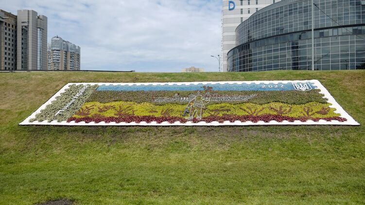 Первой композицией стала знаменитая марка с изображением украинского военного на фоне русского корабля. Это панно размером 14 на 4,5 метра, сформированное из нескольких тысяч цветов разных сортов.
