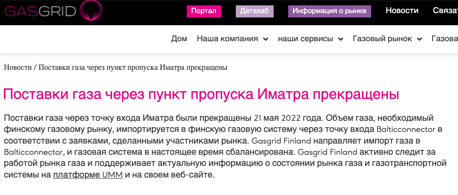 "Поставки газа через точку входа Иматра были прекращены. Объем газа, необходимый финскому газовому рынку, импортируется через точку входа Balticconnector в соответствии с заявками, сделанными участниками рынка. Gasgrid Finland направляет импорт газа в Balticconnector, и газовая система в настоящее время сбалансирована", - говорится в сообщении.