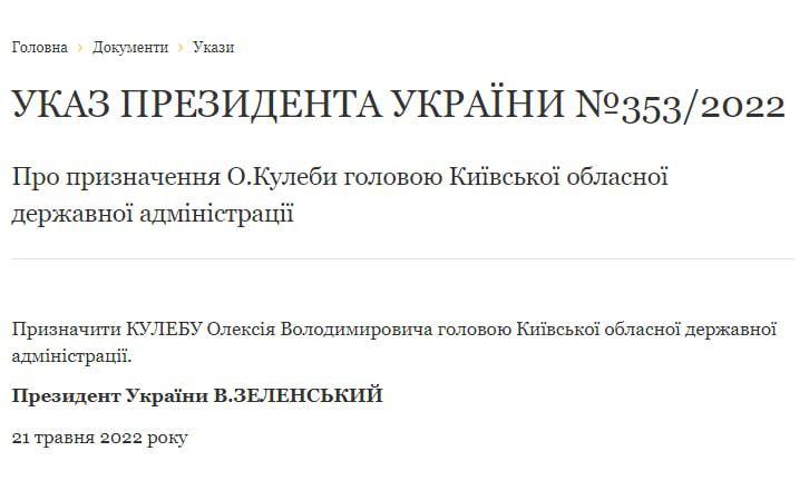 Президент Владимир Зеленский утвердил возвращение Алексея Кулебы на должность главы Киевской областной госадминистрации.
