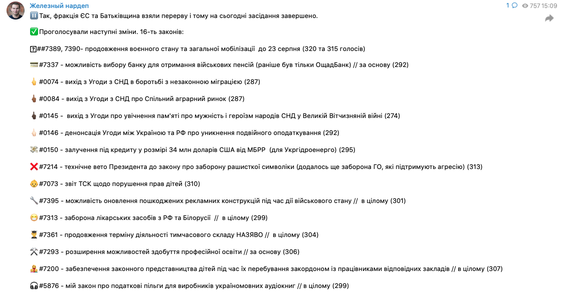 Он публикует список из 16 законопроектов, которые сегодня успел поддержать парламент.