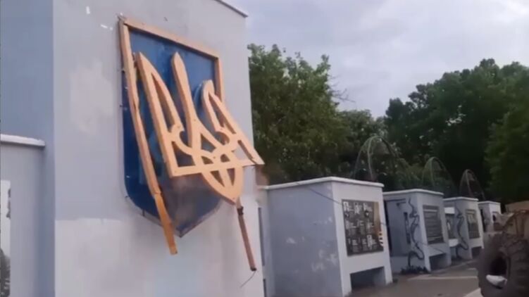 На видео можно заметить, как со стены оккупанты срывают герб Украины, зацепив его при помощи троса, привязанного к бронемашине.