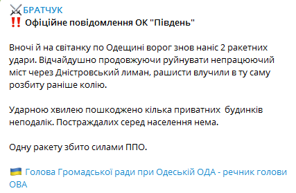 20.40 Губернатор Одесской области Максим Марченко подтвердил информацию о новом ракетном ударе по железнодорожному мосту через Днестровский лиман в районе Затоки.