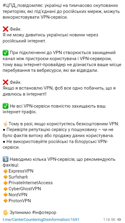 08:30 Центр по борьбе с дезинформацией при СНБО опубликовал список VPN-сервисов, которые позволяют обходить блокировки в интернете.