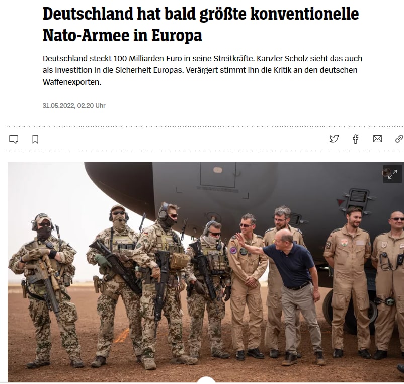 "Германия скоро будет иметь самую большую обычную армию в Европе в рамках НАТО", - сказал канцлер Олаф Шольц в интервью ряду изданий.