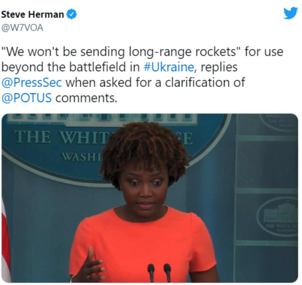 23.29 Еще одно заявление от США о том, что они не будут отправлять ракеты большой дальности для использования за пределами Украины прозвучало от пресс-секретаря Белого дома Карин Жан-Пьер.