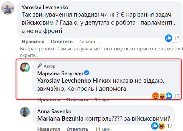 Сама Безуглая после этого написала пост, в котором, по сути, подтвердила свое нахождение там, где описали Соколова и Бутусов. Она заявила, что находится на востоке, в зоне боевых действий, поскольку является членом комитета по вопросам обороны, а также резервистом.