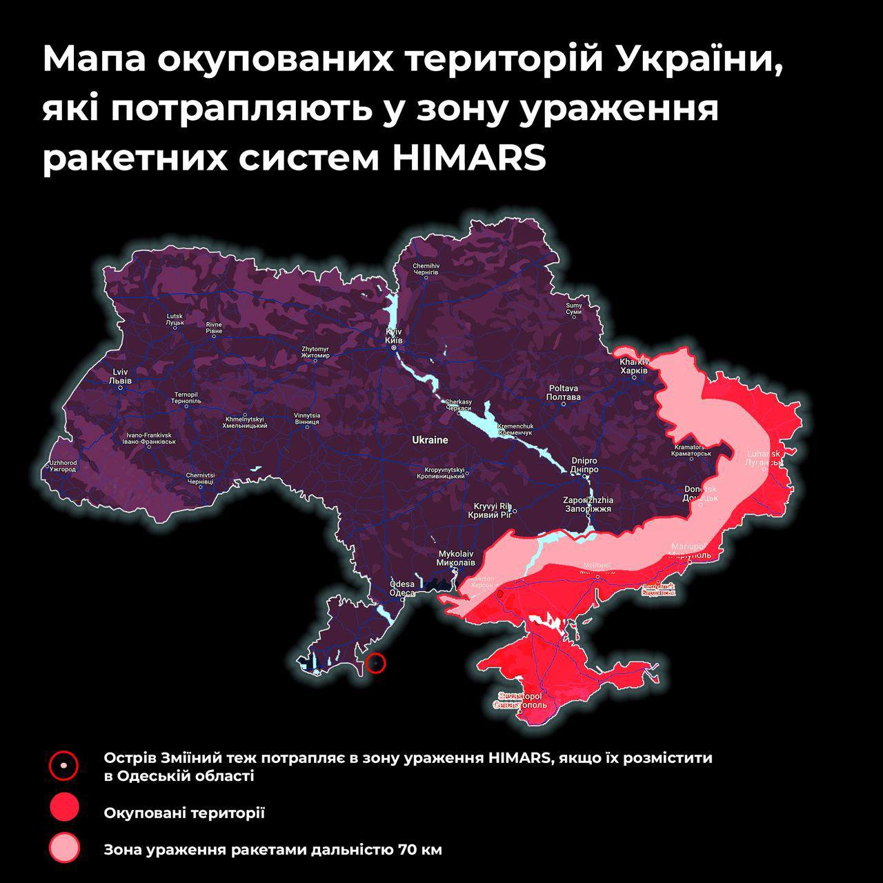 Также сегодня публиковался анализ, куда смогут добивать поставленные Украине РСЗО HIMARS. Учитывая дальность до 70-80 километров, остров Змеиный попадает в зону поражения, а вот Крым и Мариуполь - нет.