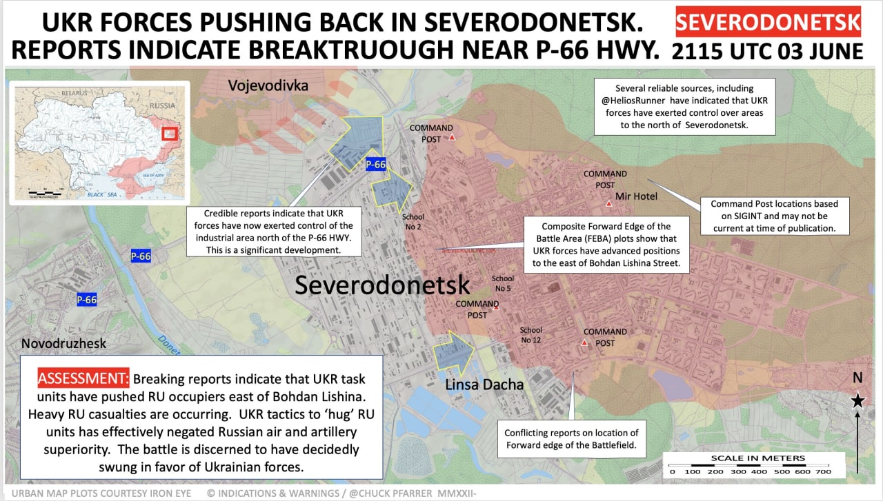 Журналист утверждает, что украинские силы продвигаются к объездной дороге P-66 у городской промзоны. Эта дорога на севере разделяет российские силы в Северодонецке и соседней Воеводовке.