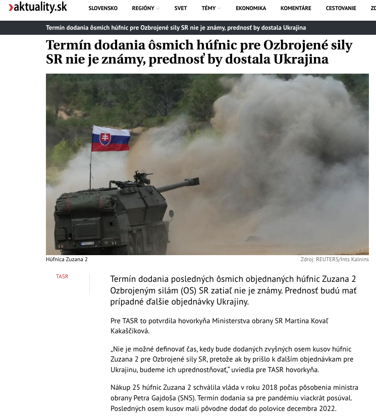 Напомним, что на этой неделе словацкая правительственная компания заключила договор на коммерческую продажу Украине восьми гаубиц Zuzana 2. Министр обороны Ярослав Надь назвал это большим успехом для словацкой оборонной промышленности.