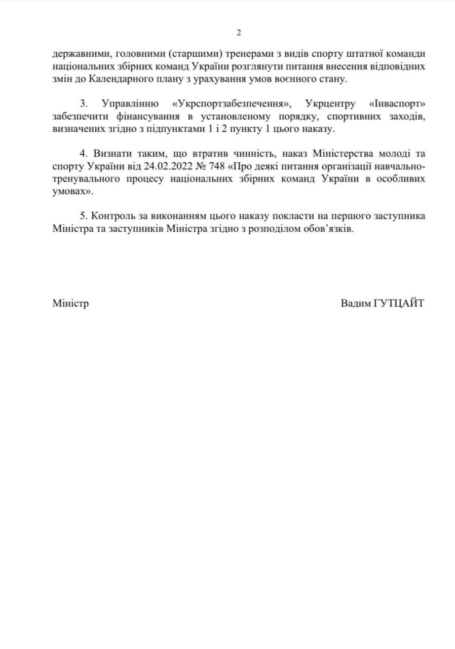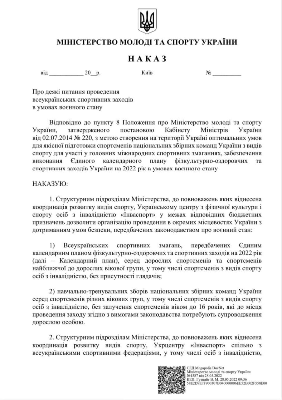 К слову, приказ о проведении спортивных мероприятий в Украине (но еще без номера), 31 мая публиковал  нардеп Жан Беленюк.