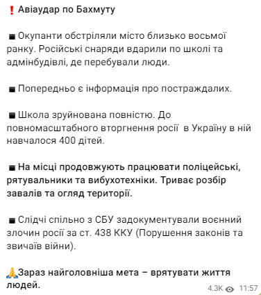 Утром в среду, 8 июня, в Бахмуте противник нанес авиаудар по школе и админзданию, в котором прятались люди. По предварительным данным, есть пострадавшие.