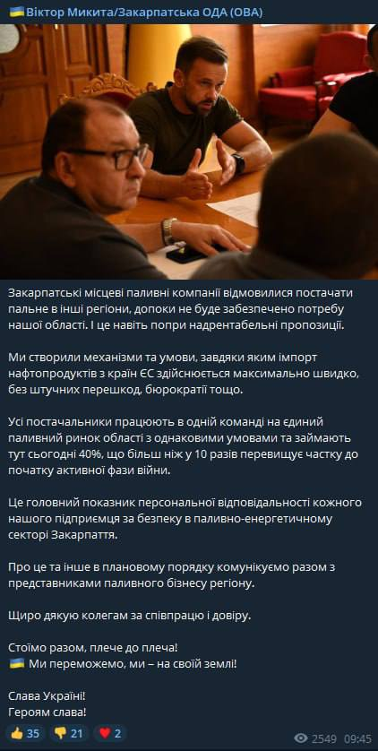 "Закарпатские местные топливные компании отказались поставлять горючее в другие регионы, пока не будет обеспечена потребность нашей области. И это даже несмотря на сверхрентабельные предложения. Мы создали механизмы и условия, благодаря которым импорт нефтепродуктов из стран ЕС производится максимально быстро, без искусственных препятствий бюрократии и т.д.