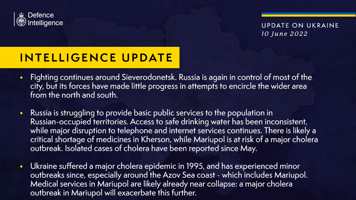 09:00 Британская разведка в своей сводке начала развивать темы холеры в Мариуполе. И в целом ситуации на оккупированных территориях.
