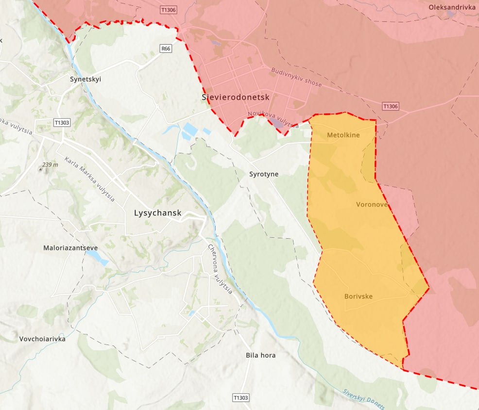- В Северодонецке отражен предполагаемый захват Метелкино и Боровского - поселков, находящихся в черте города на юге. В жилой застройке граница российского контроля идет примерно до улицы Пивоварова.