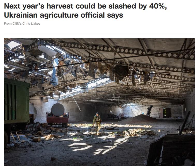 "Мы потеряли 25% пахотных земель. По объемам, конечно, больше. Мы ожидаем, что урожай будет примерно на 35% меньше, чем в предыдущие годы, то есть примерно на 30 млн тонн меньше, на 35-40% меньше, почти половина урожая прошлого года", - считает Высоцкий.