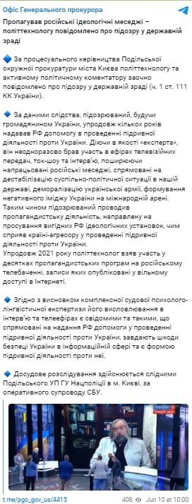 10:51 Генпрокуратура заочно объявила о подозрении известному украинскому политологу Михаилу Погребинскому. Его подозревают по статье 111 (госизмена).