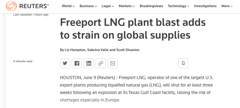 В Европе резко выросли цены на газ из-за аварии на американском заводе по производству сжиженного природного газа Freeport LNG на побережье Мексиканского залива в Техасе.