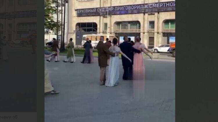 На видео - москвичи танцуют около здания ТАСС на фоне бегущей строки о смертном приговоре в "ДНР".