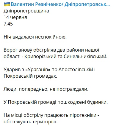 Ночью в Днепропетровской области под обстрел попали Криворожский и Синельниковский районы. По Апостоловской общине (район Кривого Рога) и Покровской (ближе к Запорожской области) россияне нанесли удар из "Ураганов".