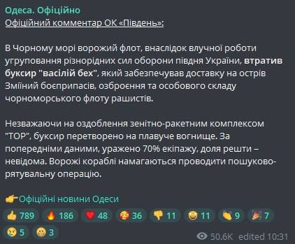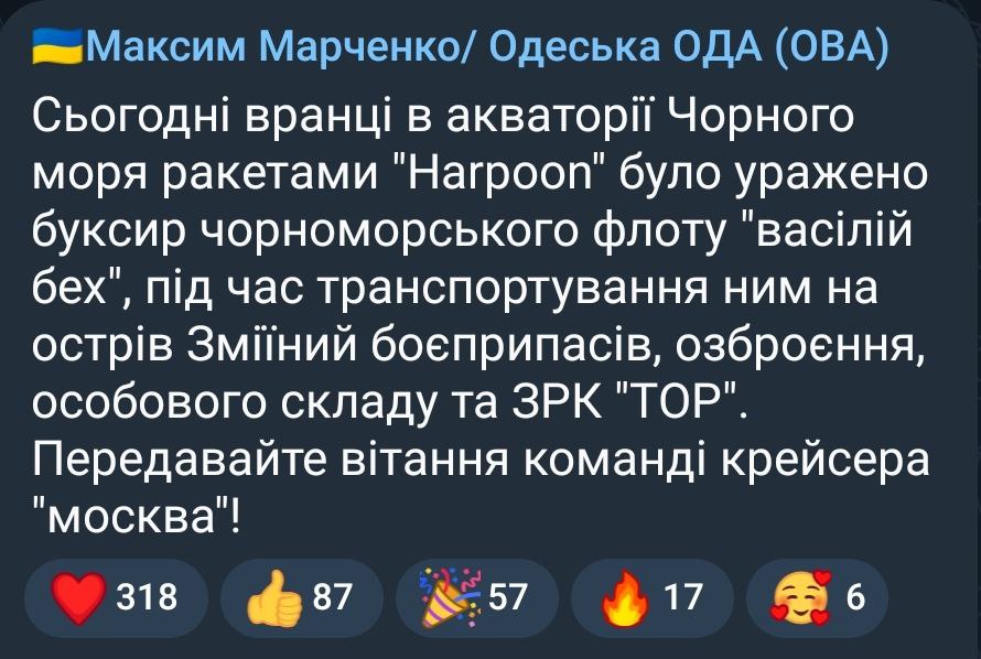 10:00 Российский буксир "Василий Бех" был поражен ракетой Harpoon с украинского побережья. Об этом сообщил глава одесской ОВА Максим Марченко.