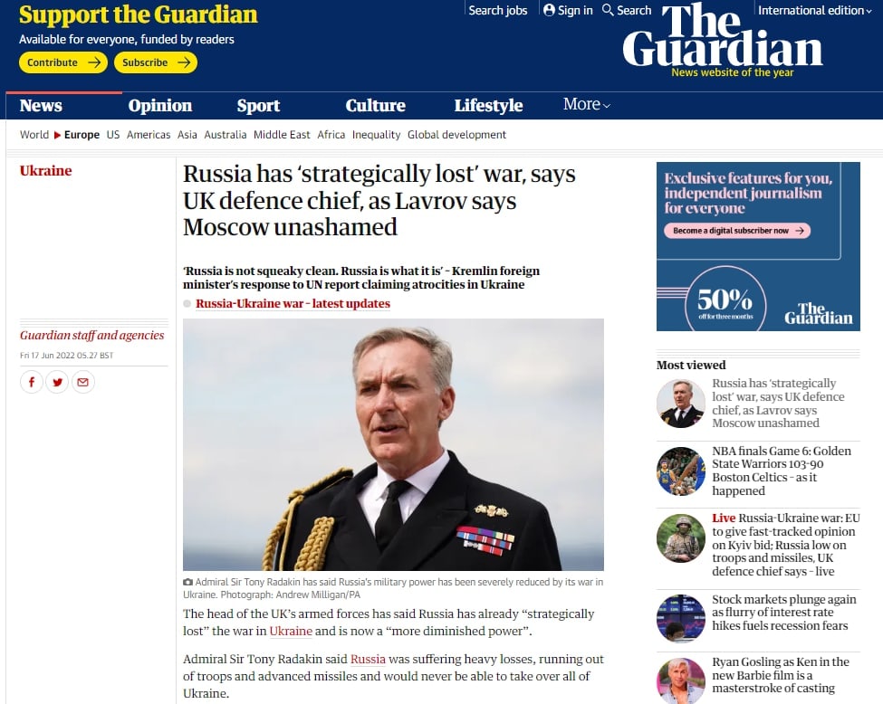 10:41 Россия "стратегически проиграла" войну против Украины, заявил начальник штаба обороны Великобритании Энтони Радакин.