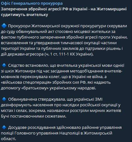 В Житомирской области будут судить учительницу украинского языка за отрицание военной агрессии против Украины.