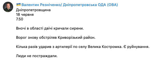 "Враг снова обстрелял Криворожский район. Несколько раз ударил из артиллерии по селу Большая Костромка. Есть разрушения. Люди не пострадали", - сообщил Резниченко.