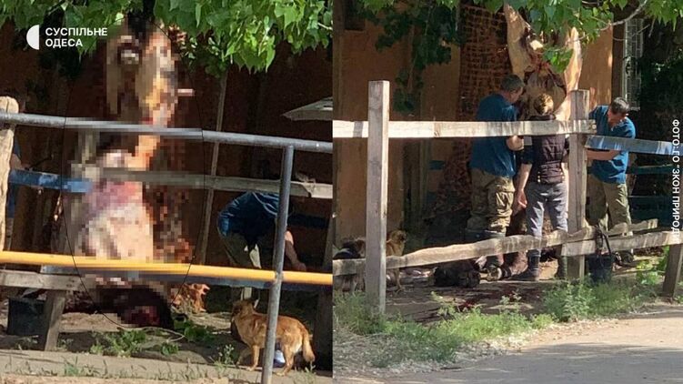На ипподроме в Одессе перерезали горло и сняли шкуру с эвакуированной лошади, которая упала и не могла больше встать. Тушу животного повесили на дерево, недалеко от площадок, где детей обучают верховой езде.