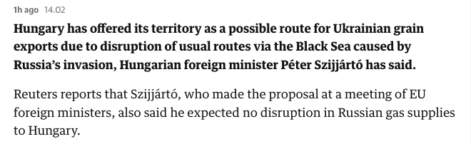 Венгрия предлагает вывозить украинское зерно через ее территорию из-за блокировки Россией черноморских портов Украины.