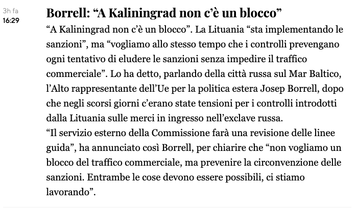 При этом верховный представитель Евросоюза Жозеп Боррель заявил, что ЕС не желает устраивать блокаду анклава, а лишь хочет выполнения антироссийских санкций, передает Il Fatto Quotidiano.