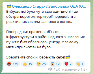 Обстрел велся из РСЗО. По предварительной информации, повреждены объекты инфраструктуры в районе одного из населенных пунктов у областного центра.
