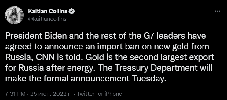 Лидеры стран G7 согласовали запрет на импорт золота из РФ - CNN
