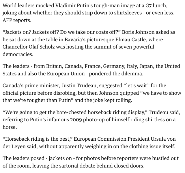 На встрече G7 в Мюнхене лидеры стран публично высмеяли Владимира Путина за его привычку сниматься в образе "мачо". Их ироничные высказывания процитировало AFP, чей фотограф сделал этот снимок и слышал разговоры участников саммита.