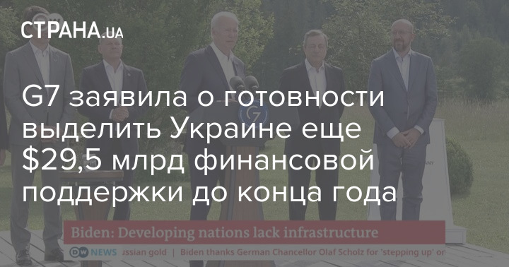 Лидеры стран G7 на саммите в Баварии заявили о готовности предоставить Украине дополнительно до 29,5 млрд долларов до конца года для покрытия дефицита бюджета.