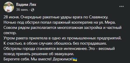 12.55 Россияне 28 июня снова нанесли ракетные удары по Славянску, сообщил мэр города Вадим Лях.